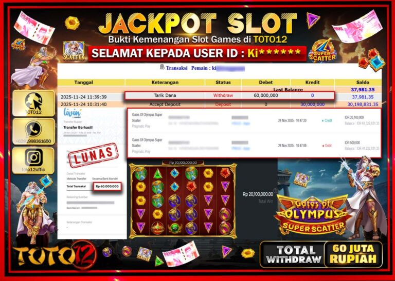 Selamat kepada Member Kami Ki****** Telah Jackpot dan berhasil mendapatkan kemenangan besar pada permainan JACKPOT SLOT GAME (GATES OF OLYMPUS SUPER SCATTER) Dengan Kemenangan Sebesar Rp.60.000.000 –. Setelah mengisi Fomulir Withdraw dengan Kurang waktu 1-2 Menit Dana sudah kami Trasnfer kepada Pemilik Userid dan dana sudah dapat di cairkan oleh pemenang. Bukti Pembayaran yang TOTO12 berikan…
