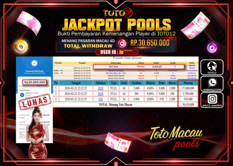 Selamat kepada Member Kami Jp****** Telah Jackpot dan berhasil mendapatkan kemenangan besar pada permainan JACKPOT POOLS PASARAN (MACAU 4D) Dengan Kemenangan Sebesar Rp.30.650.000–. Setelah mengisi Fomulir Withdraw dengan Kurang waktu 1-2 Menit Dana sudah kami Trasnfer kepada Pemilik Userid dan dana sudah dapat di cairkan oleh pemenang. Bukti Pembayaran yang TOTO12 berikan merupakan Bukti Pembayaran yang SAH…