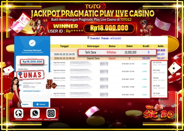 Selamat kepada Member Kami Re****** Telah Jackpot dan berhasil mendapatkan kemenangan besar pada permainan JACKPOT PRAGMATIC PLAY LIVE GAMES CASINO (MEGA SICBO INDONESIA) Dengan Kemenangan Sebesar Rp.18.000.000–. Setelah mengisi Fomulir Withdraw dengan Kurang waktu 1-2 Menit Dana sudah kami Trasnfer kepada Pemilik Userid dan dana sudah dapat di cairkan oleh pemenang. Bukti Pembayaran yang TOTO12 berikan…