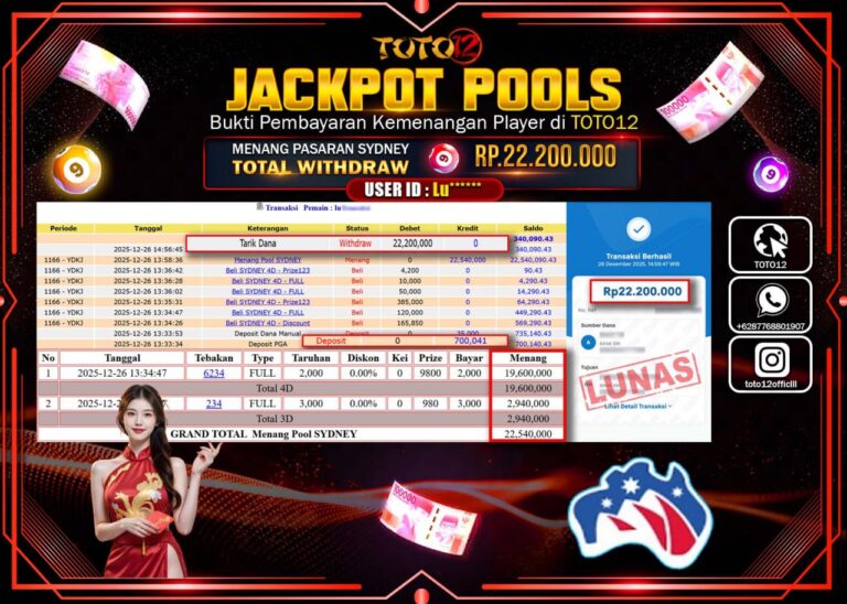 Selamat kepada Member Kami Lu****** Telah Jackpot dan berhasil mendapatkan kemenangan besar pada permainan JACKPOT POOLS PASARAN (SYDNEY) Dengan Kemenangan Sebesar Rp.22.200.000 –. Setelah mengisi Fomulir Withdraw dengan Kurang waktu 1-2 Menit Dana sudah kami Trasnfer kepada Pemilik Userid dan dana sudah dapat di cairkan oleh pemenang. Bukti Pembayaran yang TOTO12 berikan merupakan Bukti Pembayaran yang SAH…