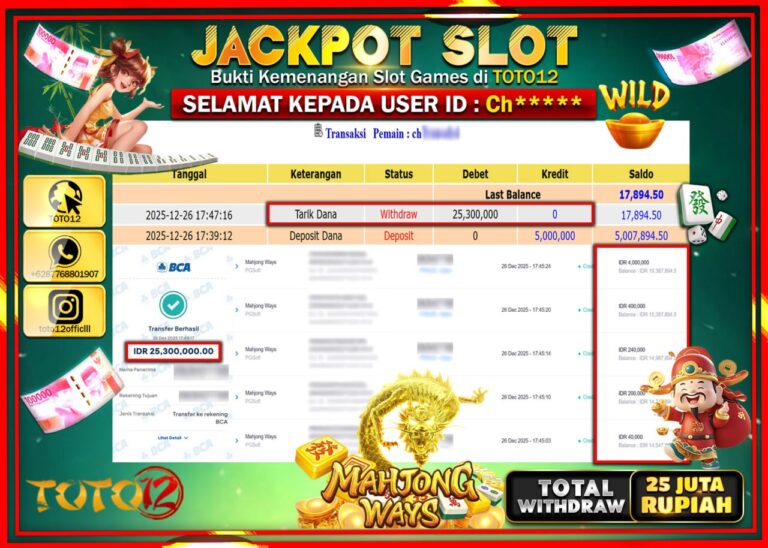 Selamat kepada Member Kami Ch****** Telah Jackpot dan berhasil mendapatkan kemenangan besar pada permainan JACKPOT SLOT GAME (MAHJONG WAYS) Dengan Kemenangan Sebesar Rp.25.300.000 –. Setelah mengisi Fomulir Withdraw dengan Kurang waktu 1-2 Menit Dana sudah kami Trasnfer kepada Pemilik Userid dan dana sudah dapat di cairkan oleh pemenang. Bukti Pembayaran yang TOTO12 berikan merupakan Bukti Pembayaran…