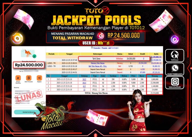 Selamat kepada Member Kami Mh****** Telah Jackpot dan berhasil mendapatkan kemenangan besar pada permainan JACKPOT POOLS PASARAN (MACAU 4D) Dengan Kemenangan Sebesar Rp.24.500.000 –. Setelah mengisi Fomulir Withdraw dengan Kurang waktu 1-2 Menit Dana sudah kami Trasnfer kepada Pemilik Userid dan dana sudah dapat di cairkan oleh pemenang. Bukti Pembayaran yang TOTO12 berikan merupakan Bukti Pembayaran…