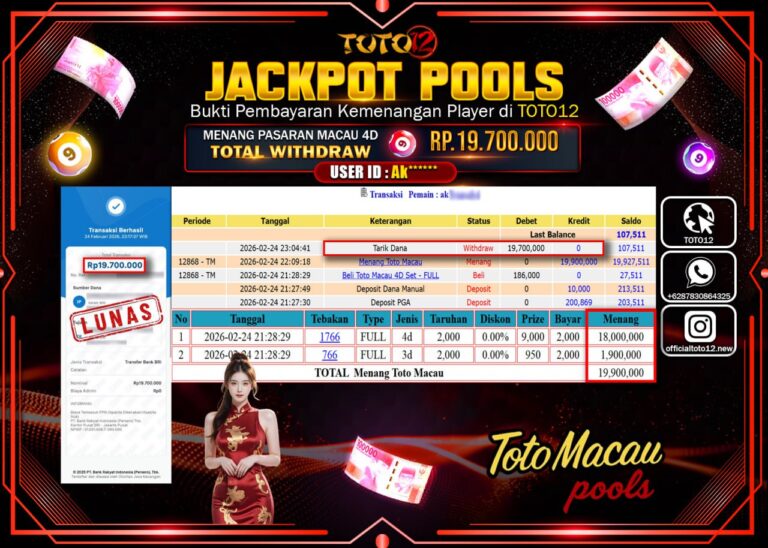 Selamat kepada Member Kami Ak****** Telah Jackpot dan berhasil mendapatkan kemenangan besar pada permainan JACKPOT POOLS PASARAN (MACAU 4D) Dengan Kemenangan Sebesar Rp.19.700.000–. Setelah mengisi Fomulir Withdraw dengan Kurang waktu 1-2 Menit Dana sudah kami Trasnfer kepada Pemilik Userid dan dana sudah dapat di cairkan oleh pemenang. Bukti Pembayaran yang TOTO12 berikan merupakan Bukti Pembayaran yang SAH…