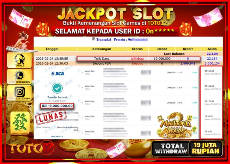 Selamat kepada Member Kami 0n***** Telah Jackpot dan berhasil mendapatkan kemenangan besar pada permainan JACKPOT SLOT GAME (MAHJONG WAYS) Dengan Kemenangan Sebesar Rp.19.000.000–. Setelah mengisi Fomulir Withdraw dengan Kurang waktu 1-2 Menit Dana sudah kami Trasnfer kepada Pemilik Userid dan dana sudah dapat di cairkan oleh pemenang. Bukti Pembayaran yang TOTO12 berikan merupakan Bukti Pembayaran yang SAH…