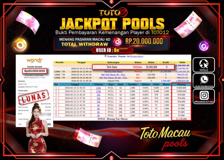 Selamat kepada Member Kami Fd****** Telah Jackpot dan berhasil mendapatkan kemenangan besar pada permainan JACKPOT POOLS PASARAN (MACAU 4D) Dengan Kemenangan Sebesar Rp.20.000.000–. Setelah mengisi Fomulir Withdraw dengan Kurang waktu 1-2 Menit Dana sudah kami Trasnfer kepada Pemilik Userid dan dana sudah dapat di cairkan oleh pemenang. Bukti Pembayaran yang TOTO12 berikan merupakan Bukti Pembayaran yang SAH…