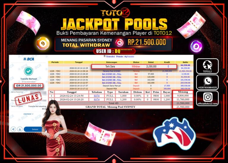 HANYA DI TOTO12 JP PASTI DI BAYAR LUNAS DAN CEPAT!!!!!! JACKPOT POOLS PASARAN (SYDNEY) Rp.21.500.000!!!!