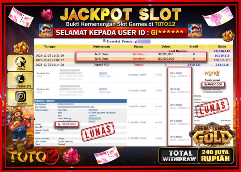 Selamat kepada Member Kami Gi****** Telah Jackpot dan berhasil mendapatkan kemenangan besar pada permainan JACKPOT SLOT GAME (GEMSTONES GOLD) Dengan Kemenangan Sebesar Rp.240.000.000 –. Setelah mengisi Fomulir Withdraw dengan Kurang waktu 1-2 Menit Dana sudah kami Trasnfer kepada Pemilik Userid dan dana sudah dapat di cairkan oleh pemenang. Bukti Pembayaran yang TOTO12 berikan merupakan Bukti Pembayaran…