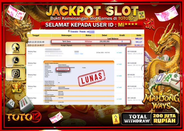 Selamat kepada Member Kami Mi****** Telah Jackpot dan berhasil mendapatkan kemenangan besar pada permainan JACKPOT SLOT GAME (MAHJONG WAYS) Dengan Kemenangan Sebesar Rp.200.000.000 –. Setelah mengisi Fomulir Withdraw dengan Kurang waktu 1-2 Menit Dana sudah kami Trasnfer kepada Pemilik Userid dan dana sudah dapat di cairkan oleh pemenang. Bukti Pembayaran yang TOTO12 berikan merupakan Bukti Pembayaran…