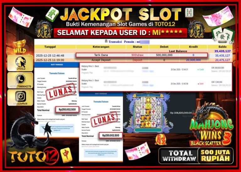 Selamat kepada Member Kami Mi****** Telah Jackpot dan berhasil mendapatkan kemenangan besar pada permainan JACKPOT SLOT GAME (MAHJONG WINS 3 BLACK SCATTER) Dengan Kemenangan Sebesar Rp.500.000.000 –. Setelah mengisi Fomulir Withdraw dengan Kurang waktu 1-2 Menit Dana sudah kami Trasnfer kepada Pemilik Userid dan dana sudah dapat di cairkan oleh pemenang. Bukti Pembayaran yang TOTO12 berikan…