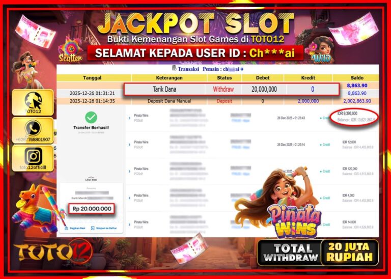 Selamat kepada Member Kami Ch****** Telah Jackpot dan berhasil mendapatkan kemenangan besar pada permainan JACKPOT SLOT GAME (PINATA WINS) Dengan Kemenangan Sebesar Rp.20.000.000 –. Setelah mengisi Fomulir Withdraw dengan Kurang waktu 1-2 Menit Dana sudah kami Trasnfer kepada Pemilik Userid dan dana sudah dapat di cairkan oleh pemenang. Bukti Pembayaran yang TOTO12 berikan merupakan Bukti Pembayaran…