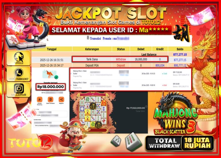 Selamat kepada Member Kami Ma****** Telah Jackpot dan berhasil mendapatkan kemenangan besar pada permainan JACKPOT SLOT GAME (MAHJONG WINS 3 BLACK SCATTER) Dengan Kemenangan Sebesar Rp.18.000.000 –. Setelah mengisi Fomulir Withdraw dengan Kurang waktu 1-2 Menit Dana sudah kami Trasnfer kepada Pemilik Userid dan dana sudah dapat di cairkan oleh pemenang. Bukti Pembayaran yang TOTO12 berikan…