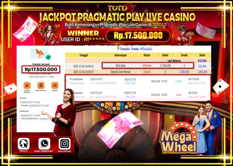 Selamat kepada Member Kami Ba****** Telah Jackpot dan berhasil mendapatkan kemenangan besar pada permainan JACKPOT PRAGMATIC PLAY LIVE CASINO (MEGA WHEEL) Dengan Kemenangan Sebesar Rp.17.500.000 –. Setelah mengisi Fomulir Withdraw dengan Kurang waktu 1-2 Menit Dana sudah kami Trasnfer kepada Pemilik Userid dan dana sudah dapat di cairkan oleh pemenang. Bukti Pembayaran yang TOTO12 berikan merupakan…