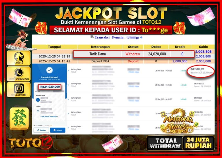 Selamat kepada Member Kami To****** Telah Jackpot dan berhasil mendapatkan kemenangan besar pada permainan JACKPOT SLOT GAME (MAHJONG WAYS) Dengan Kemenangan Sebesar Rp.24.020.000 –. Setelah mengisi Fomulir Withdraw dengan Kurang waktu 1-2 Menit Dana sudah kami Trasnfer kepada Pemilik Userid dan dana sudah dapat di cairkan oleh pemenang. Bukti Pembayaran yang TOTO12 berikan merupakan Bukti Pembayaran…