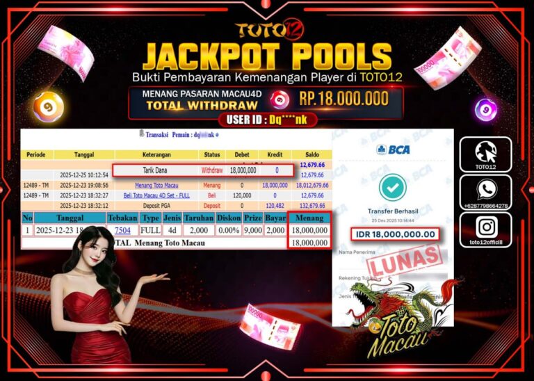 Selamat kepada Member Kami Dq****** Telah Jackpot dan berhasil mendapatkan kemenangan besar pada permainan JACKPOT POOLS PASARAN (MACAU 4D) Dengan Kemenangan Sebesar Rp.18.000.000 –. Setelah mengisi Fomulir Withdraw dengan Kurang waktu 1-2 Menit Dana sudah kami Trasnfer kepada Pemilik Userid dan dana sudah dapat di cairkan oleh pemenang. Bukti Pembayaran yang TOTO12 berikan merupakan Bukti Pembayaran…