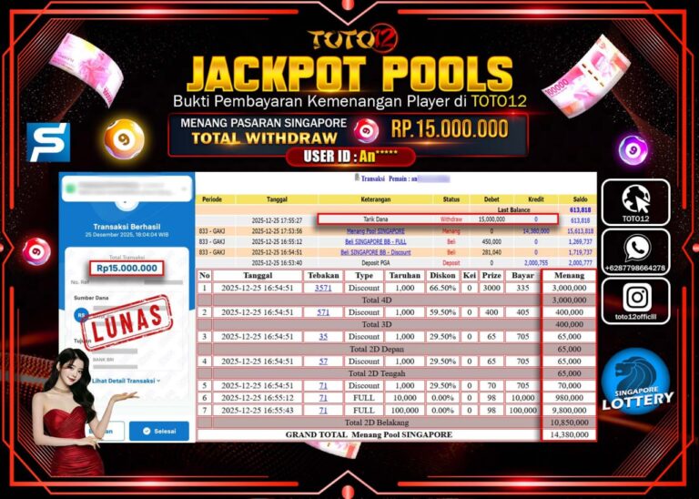 Selamat kepada Member Kami An****** Telah Jackpot dan berhasil mendapatkan kemenangan besar pada permainan JACKPOT POOLS PASARAN (SINGAPORE) Dengan Kemenangan Sebesar Rp.15.000.000 –. Setelah mengisi Fomulir Withdraw dengan Kurang waktu 1-2 Menit Dana sudah kami Trasnfer kepada Pemilik Userid dan dana sudah dapat di cairkan oleh pemenang. Bukti Pembayaran yang TOTO12 berikan merupakan Bukti Pembayaran yang SAH…