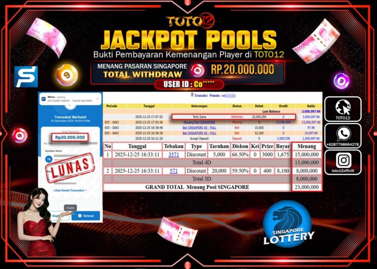 Selamat kepada Member Kami Co****** Telah Jackpot dan berhasil mendapatkan kemenangan besar pada permainan JACKPOT POOLS PASARAN (SINGAPORE) Dengan Kemenangan Sebesar Rp.20.000.000 –. Setelah mengisi Fomulir Withdraw dengan Kurang waktu 1-2 Menit Dana sudah kami Trasnfer kepada Pemilik Userid dan dana sudah dapat di cairkan oleh pemenang. Bukti Pembayaran yang TOTO12 berikan merupakan Bukti Pembayaran yang SAH…