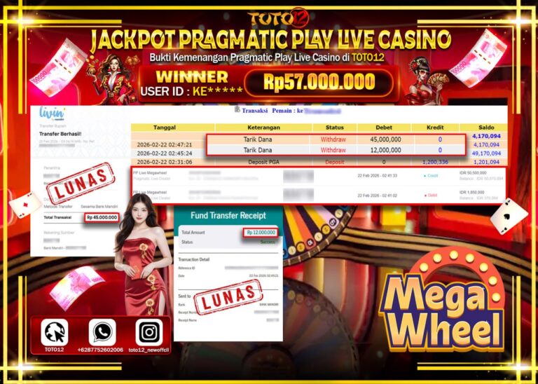 Selamat kepada Member Kami Ke****** Telah Jackpot dan berhasil mendapatkan kemenangan besar pada permainan JACKPOT PRAGMATIC PLAY LIVE GAMES CASINO (PP LIVE MEGA WHEEL) Dengan Kemenangan Sebesar Rp.57.000.000–. Setelah mengisi Fomulir Withdraw dengan Kurang waktu 1-2 Menit Dana sudah kami Trasnfer kepada Pemilik Userid dan dana sudah dapat di cairkan oleh pemenang. Bukti Pembayaran yang TOTO12…