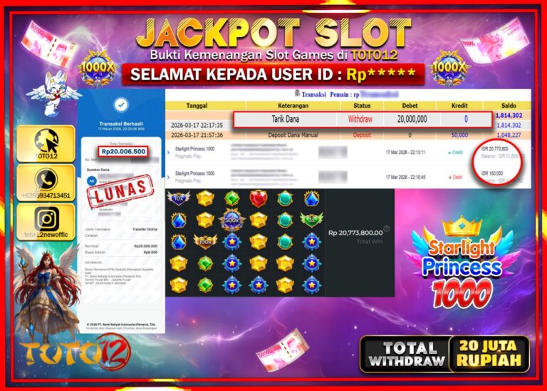 Selamat kepada Member Kami Rp****** Telah Jackpot dan berhasil mendapatkan kemenangan besar pada permainan JACKPOT SLOT GAME (STARLIGHT PRINCESS 1000) Dengan Kemenangan Sebesar Rp.20.000.000. Setelah mengisi Fomulir Withdraw dengan Kurang waktu 1-2 Menit Dana sudah kami Trasnfer kepada Pemilik Userid dan dana sudah dapat di cairkan oleh pemenang. Bukti Pembayaran yang TOTO12 berikan merupakan Bukti Pembayaran…