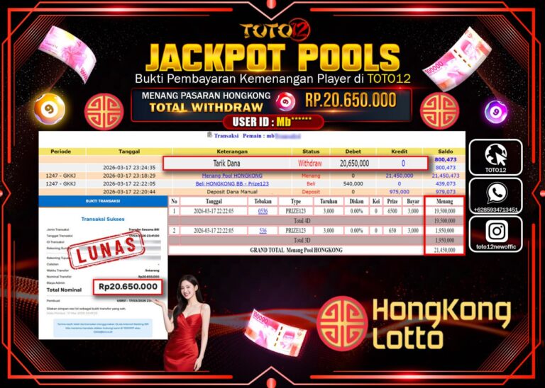 Selamat kepada Member Kami Mb***** Telah Jackpot dan berhasil mendapatkan kemenangan besar pada permainan JACKPOT POOLS PASARAN (HONGKONG) Dengan Kemenangan Sebesar Rp.20.650.000–. Setelah mengisi Fomulir Withdraw dengan Kurang waktu 1-2 Menit Dana sudah kami Trasnfer kepada Pemilik Userid dan dana sudah dapat di cairkan oleh pemenang. Bukti Pembayaran yang TOTO12 berikan merupakan Bukti Pembayaran yang SAH /…