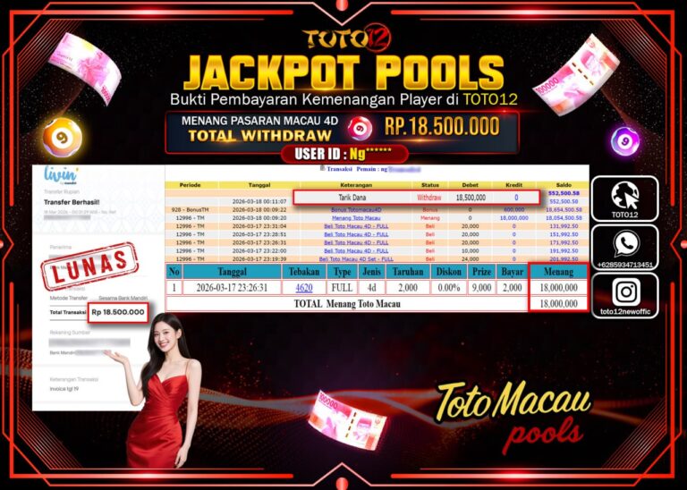 Selamat kepada Member Kami Ng***** Telah Jackpot dan berhasil mendapatkan kemenangan besar pada permainan JACKPOT POOLS PASARAN (MACAU 4D) Dengan Kemenangan Sebesar Rp.18.500.000–. Setelah mengisi Fomulir Withdraw dengan Kurang waktu 1-2 Menit Dana sudah kami Trasnfer kepada Pemilik Userid dan dana sudah dapat di cairkan oleh pemenang. Bukti Pembayaran yang TOTO12 berikan merupakan Bukti Pembayaran yang SAH…