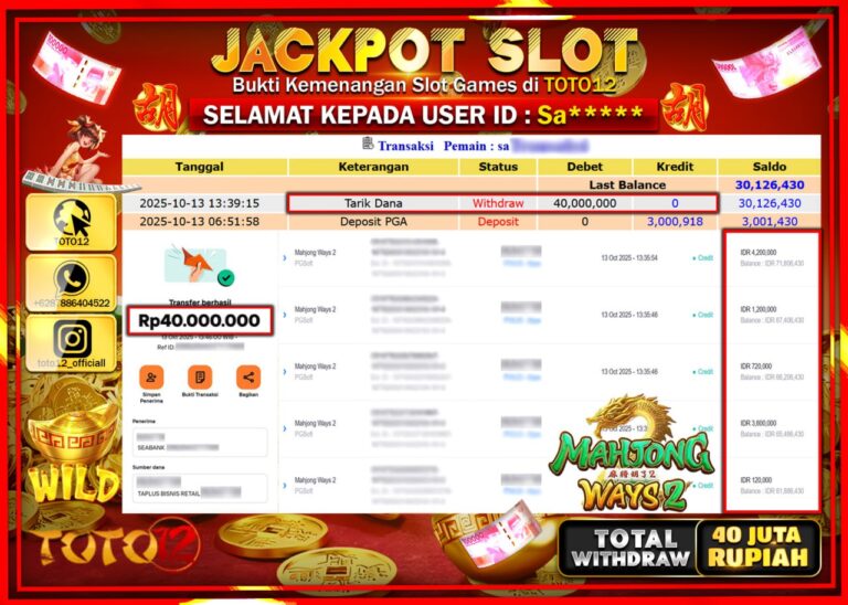 Selamat kepada Member Kami Sa****** Telah Jackpot dan berhasil mendapatkan kemenangan besar pada permainan JACKPOT SLOT GAME (MAHJONG WAYS 2) Dengan Kemenangan Sebesar Rp.40.000.000 –. Setelah mengisi Fomulir Withdraw dengan Kurang waktu 1-2 Menit Dana sudah kami Trasnfer kepada Pemilik Userid dan dana sudah dapat di cairkan oleh pemenang. Bukti Pembayaran yang TOTO12 berikan merupakan Bukti…