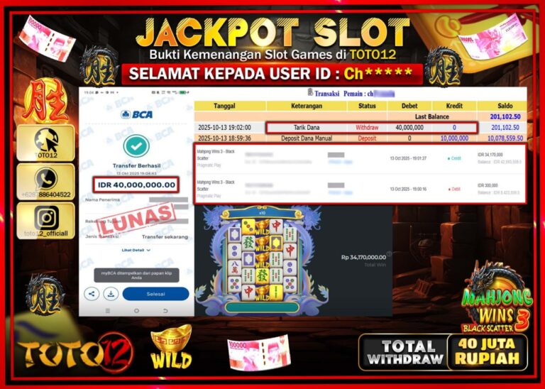 Selamat kepada Member Kami Ch****** Telah Jackpot dan berhasil mendapatkan kemenangan besar pada permainan JACKPOT SLOT GAME (MAHJONG WINS 3 BLACK SCATTER) Dengan Kemenangan Sebesar Rp.40.000.000 –. Setelah mengisi Fomulir Withdraw dengan Kurang waktu 1-2 Menit Dana sudah kami Trasnfer kepada Pemilik Userid dan dana sudah dapat di cairkan oleh pemenang. Bukti Pembayaran yang TOTO12 berikan…