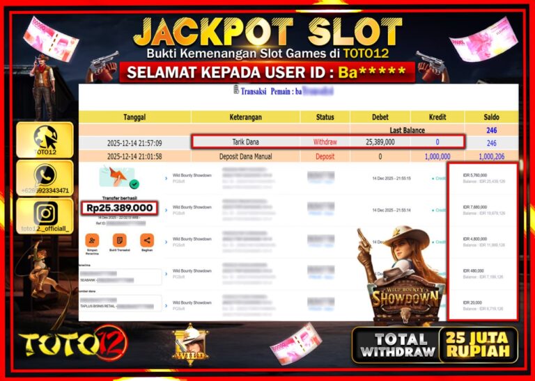 Selamat kepada Member Kami Ba****** Telah Jackpot dan berhasil mendapatkan kemenangan besar pada permainan JACKPOT SLOT GAME (WILD BOUNTY SHOWDOWN) Dengan Kemenangan Sebesar Rp.25.389.000 –. Setelah mengisi Fomulir Withdraw dengan Kurang waktu 1-2 Menit Dana sudah kami Trasnfer kepada Pemilik Userid dan dana sudah dapat di cairkan oleh pemenang. Bukti Pembayaran yang TOTO12 berikan merupakan Bukti…