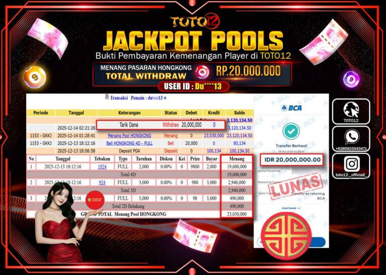 Selamat kepada Member Kami Du****** Telah Jackpot dan berhasil mendapatkan kemenangan besar pada permainan JACKPOT POOLS PASARAN (HONGKONG) Dengan Kemenangan Sebesar Rp.20.000.000 –. Setelah mengisi Fomulir Withdraw dengan Kurang waktu 1-2 Menit Dana sudah kami Trasnfer kepada Pemilik Userid dan dana sudah dapat di cairkan oleh pemenang. Bukti Pembayaran yang TOTO12 berikan merupakan Bukti Pembayaran yang SAH…