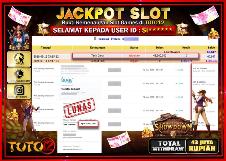 Selamat kepada Member Kami Si****** Telah Jackpot dan berhasil mendapatkan kemenangan besar pada permainan JACKPOT SLOT GAME (WILD BOUNTY SHOWDOWN) Dengan Kemenangan Sebesar Rp.43.300.000. Setelah mengisi Fomulir Withdraw dengan Kurang waktu 1-2 Menit Dana sudah kami Trasnfer kepada Pemilik Userid dan dana sudah dapat di cairkan oleh pemenang. Bukti Pembayaran yang TOTO12 berikan merupakan Bukti Pembayaran…