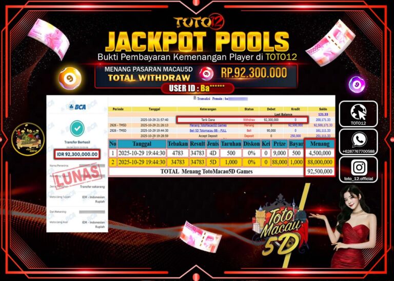 Selamat kepada Member Kami Ba****** Telah Jackpot dan berhasil mendapatkan kemenangan besar pada permainan JACKPOT POOLS PASARAN (MACAU 5D) Dengan Kemenangan Sebesar Rp.92.300.000 –. Setelah mengisi Fomulir Withdraw dengan Kurang waktu 1-2 Menit Dana sudah kami Trasnfer kepada Pemilik Userid dan dana sudah dapat di cairkan oleh pemenang. Bukti Pembayaran yang TOTO12 berikan merupakan Bukti Pembayaran…