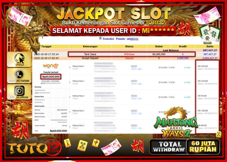 Selamat kepada Member Kami Mi****** Telah Jackpot dan berhasil mendapatkan kemenangan besar pada permainan JACKPOT SLOT GAME (MAHJONG WAYS 2) Dengan Kemenangan Sebesar Rp.60.000.000 –. Setelah mengisi Fomulir Withdraw dengan Kurang waktu 1-2 Menit Dana sudah kami Trasnfer kepada Pemilik Userid dan dana sudah dapat di cairkan oleh pemenang. Bukti Pembayaran yang TOTO12 berikan merupakan Bukti…