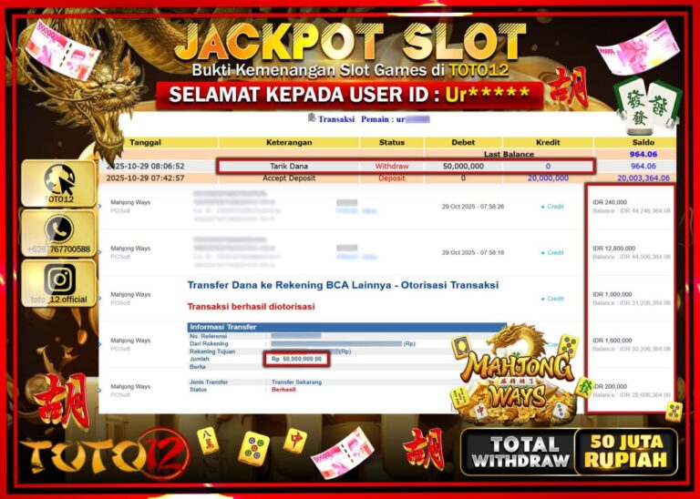 Selamat kepada Member Kami Ur****** Telah Jackpot dan berhasil mendapatkan kemenangan besar pada permainan JACKPOT SLOT GAME (MAHJONG WAYS) Dengan Kemenangan Sebesar Rp.50.000.000 –. Setelah mengisi Fomulir Withdraw dengan Kurang waktu 1-2 Menit Dana sudah kami Trasnfer kepada Pemilik Userid dan dana sudah dapat di cairkan oleh pemenang. Bukti Pembayaran yang TOTO12 berikan merupakan Bukti Pembayaran…