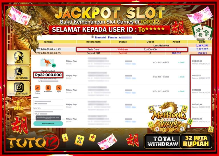 Selamat kepada Member Kami To****** Telah Jackpot dan berhasil mendapatkan kemenangan besar pada permainan JACKPOT SLOT GAME (MAHJONG WAYS) Dengan Kemenangan Sebesar Rp.32.000.000 –. Setelah mengisi Fomulir Withdraw dengan Kurang waktu 1-2 Menit Dana sudah kami Trasnfer kepada Pemilik Userid dan dana sudah dapat di cairkan oleh pemenang. Bukti Pembayaran yang TOTO12 berikan merupakan Bukti Pembayaran…