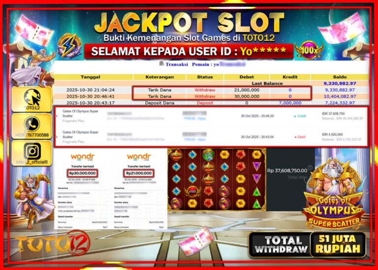 Selamat kepada Member Kami Yo****** Telah Jackpot dan berhasil mendapatkan kemenangan besar pada permainan JACKPOT SLOT GAME (GATES OF OLYMPUS SUPER SCATTER) Dengan Kemenangan Sebesar Rp.51.000.000 –. Setelah mengisi Fomulir Withdraw dengan Kurang waktu 1-2 Menit Dana sudah kami Trasnfer kepada Pemilik Userid dan dana sudah dapat di cairkan oleh pemenang. Bukti Pembayaran yang TOTO12 berikan…