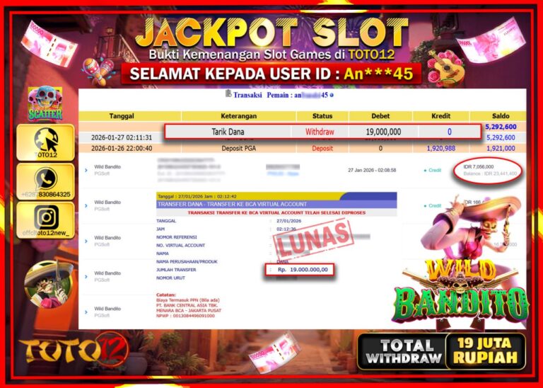 Selamat kepada Member Kami An****** Telah Jackpot dan berhasil mendapatkan kemenangan besar pada permainan JACKPOT SLOT GAME (WILD BANDITO) Dengan Kemenangan Sebesar Rp.19.000.000 –. Setelah mengisi Fomulir Withdraw dengan Kurang waktu 1-2 Menit Dana sudah kami Trasnfer kepada Pemilik Userid dan dana sudah dapat di cairkan oleh pemenang. Bukti Pembayaran yang TOTO12 berikan merupakan Bukti Pembayaran…