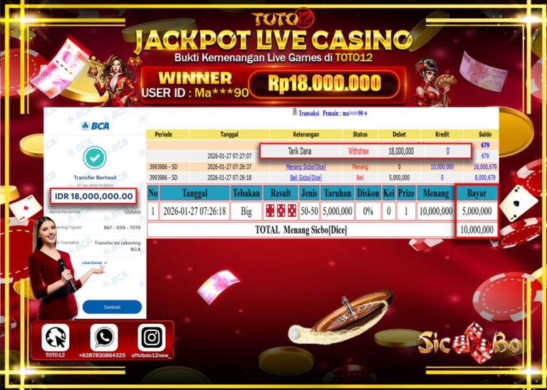Selamat kepada Member Kami Ma****** Telah Jackpot dan berhasil mendapatkan kemenangan besar pada permainan JACKPOT LIVE CASINO (SIC BO) Dengan Kemenangan Sebesar Rp.18.000.000 –. Setelah mengisi Fomulir Withdraw dengan Kurang waktu 1-2 Menit Dana sudah kami Trasnfer kepada Pemilik Userid dan dana sudah dapat di cairkan oleh pemenang. Bukti Pembayaran yang TOTO12 berikan merupakan Bukti Pembayaran…
