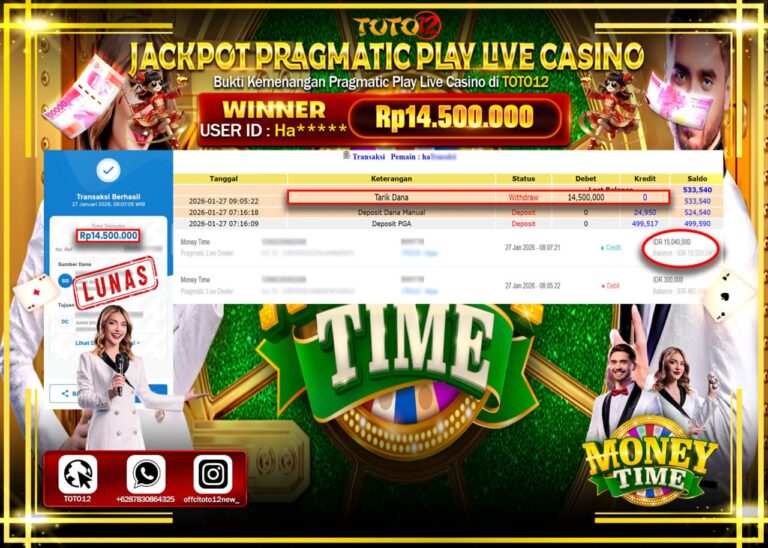 HANYA DI TOTO12 JP PASTI DI BAYAR LUNAS DAN CEPAT!!!!!! JACKPOT PRAGMATIC PLAY LIVE CASINO (MONEY TIME) Rp.14.500.000 !!!