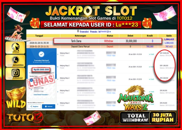 Selamat kepada Member Kami Lu****** Telah Jackpot dan berhasil mendapatkan kemenangan besar pada permainan JACKPOT SLOT GAME (MAHJONG WAYS 2) Dengan Kemenangan Sebesar Rp.30.000.000 –. Setelah mengisi Fomulir Withdraw dengan Kurang waktu 1-2 Menit Dana sudah kami Trasnfer kepada Pemilik Userid dan dana sudah dapat di cairkan oleh pemenang. Bukti Pembayaran yang TOTO12 berikan merupakan Bukti…
