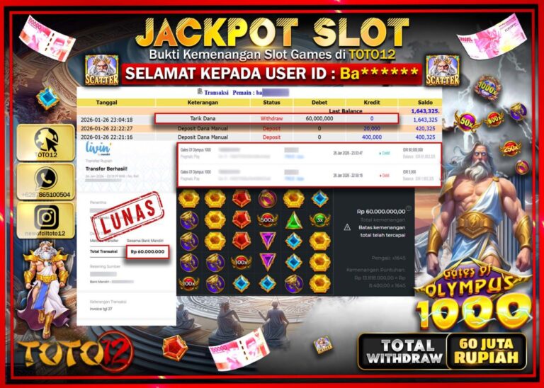 Selamat kepada Member Kami Ba****** Telah Jackpot dan berhasil mendapatkan kemenangan besar pada permainan JACKPOT SLOT GAME (GATES OF OLYMPUS 1000) Dengan Kemenangan Sebesar Rp.60.000.000 –. Setelah mengisi Fomulir Withdraw dengan Kurang waktu 1-2 Menit Dana sudah kami Trasnfer kepada Pemilik Userid dan dana sudah dapat di cairkan oleh pemenang. Bukti Pembayaran yang TOTO12 berikan merupakan…