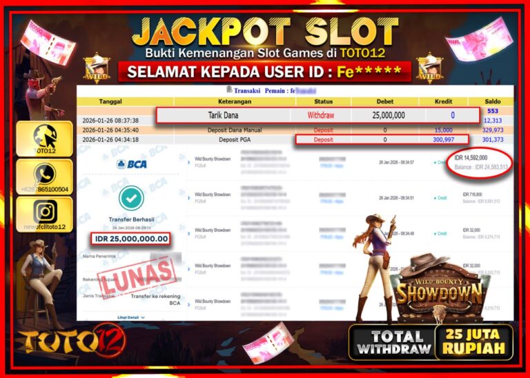 Selamat kepada Member Kami Fe****** Telah Jackpot dan berhasil mendapatkan kemenangan besar pada permainan JACKPOT SLOT GAME (WILD BOUNTY SHOWDOWN) Dengan Kemenangan Sebesar Rp.25.000.000 –. Setelah mengisi Fomulir Withdraw dengan Kurang waktu 1-2 Menit Dana sudah kami Trasnfer kepada Pemilik Userid dan dana sudah dapat di cairkan oleh pemenang. Bukti Pembayaran yang TOTO12 berikan merupakan Bukti…