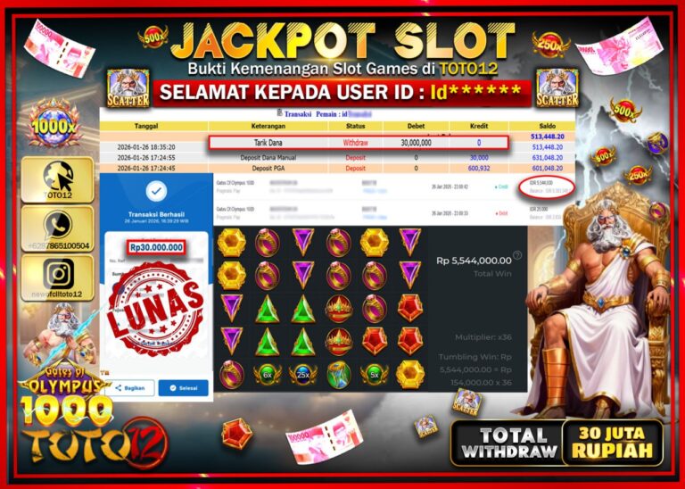 Selamat kepada Member Kami Id****** Telah Jackpot dan berhasil mendapatkan kemenangan besar pada permainan JACKPOT SLOT GAME (GATES OF OLYMPUS 1000) Dengan Kemenangan Sebesar Rp.30.000.000 –. Setelah mengisi Fomulir Withdraw dengan Kurang waktu 1-2 Menit Dana sudah kami Trasnfer kepada Pemilik Userid dan dana sudah dapat di cairkan oleh pemenang. Bukti Pembayaran yang TOTO12 berikan merupakan…