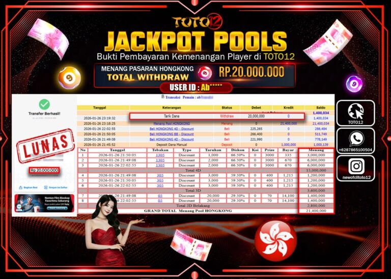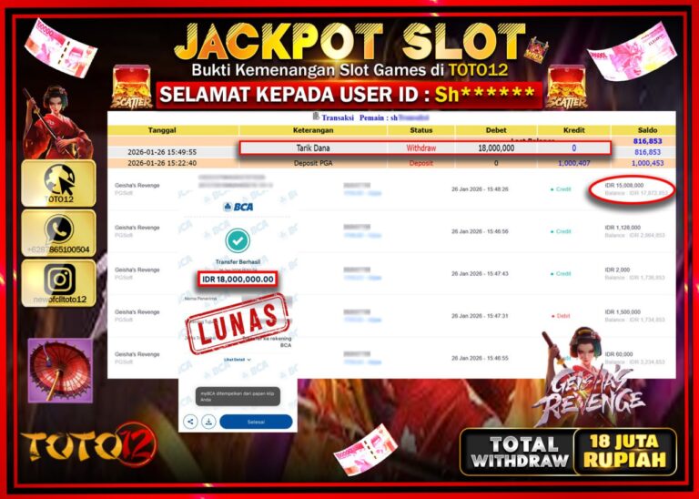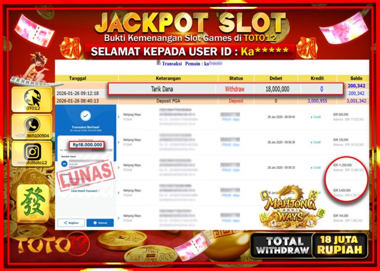 Selamat kepada Member Kami Ka****** Telah Jackpot dan berhasil mendapatkan kemenangan besar pada permainan JACKPOT SLOT GAME (MAHJONG WAYS) Dengan Kemenangan Sebesar Rp.30.000.000 –. Setelah mengisi Fomulir Withdraw dengan Kurang waktu 1-2 Menit Dana sudah kami Trasnfer kepada Pemilik Userid dan dana sudah dapat di cairkan oleh pemenang. Bukti Pembayaran yang TOTO12 berikan merupakan Bukti Pembayaran…