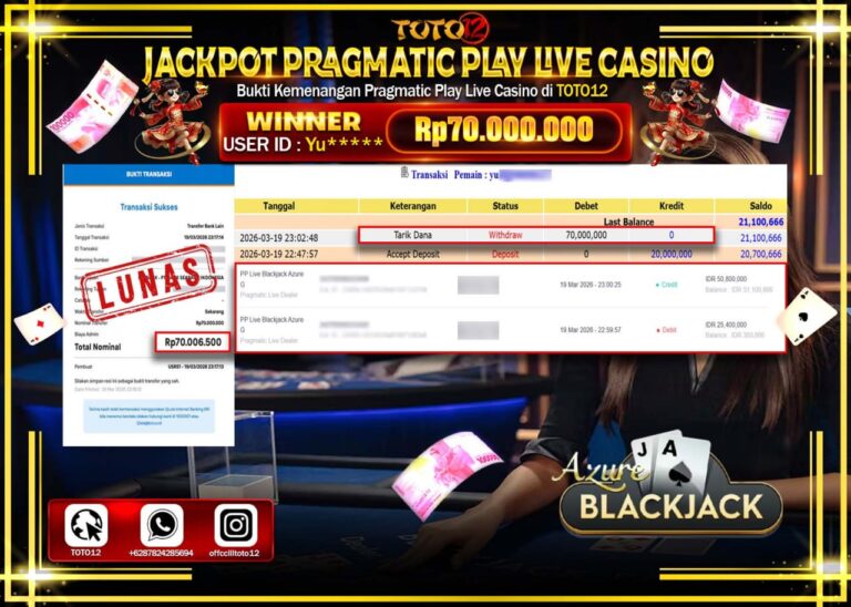 Selamat kepada Member Kami Yu****** Telah Jackpot dan berhasil mendapatkan kemenangan besar pada permainan JACKPOT PRAGMATIC PLAY LIVE GAME CASINO (PP LIVE BLACKJACK AZURE G) Dengan Kemenangan Sebesar Rp.70.000.000–. Setelah mengisi Fomulir Withdraw dengan Kurang waktu 1-2 Menit Dana sudah kami Trasnfer kepada Pemilik Userid dan dana sudah 75.000.000di cairkan oleh pemenang. Bukti Pembayaran yang TOTO12…