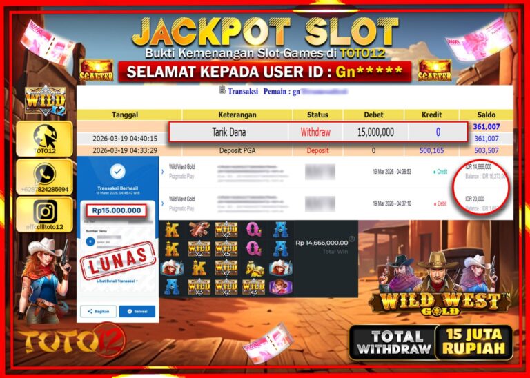 Selamat kepada Member Kami Gn**** Telah Jackpot dan berhasil mendapatkan kemenangan besar pada permainan JACKPOT SLOT GAME (WILD WEST GOLD) Dengan Kemenangan Sebesar Rp.15.000.000–. Setelah mengisi Fomulir Withdraw dengan Kurang waktu 1-2 Menit Dana sudah kami Trasnfer kepada Pemilik Userid dan dana sudah dapat di cairkan oleh pemenang. Bukti Pembayaran yang TOTO12 berikan merupakan Bukti Pembayaran…