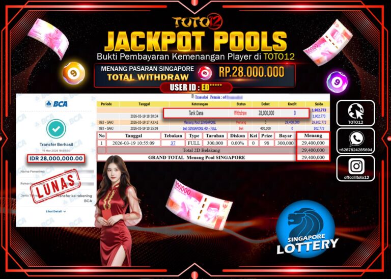 Selamat kepada Member Kami ED***** Telah Jackpot dan berhasil mendapatkan kemenangan besar pada permainan JACKPOT POOLS PASARAN (SINGAPORE) Dengan Kemenangan Sebesar Rp.28.000.000–. Setelah mengisi Fomulir Withdraw dengan Kurang waktu 1-2 Menit Dana sudah kami Trasnfer kepada Pemilik Userid dan dana sudah dapat di cairkan oleh pemenang. Bukti Pembayaran yang TOTO12 berikan merupakan Bukti Pembayaran yang SAH /…