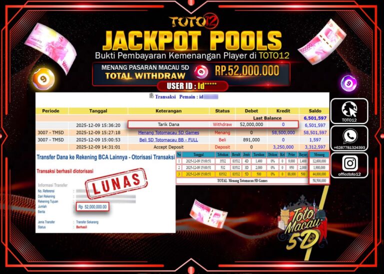Selamat kepada Member Kami Id****** Telah Jackpot dan berhasil mendapatkan kemenangan besar pada permainan JACKPOT POOLS PASARAN (MACAU 5D) Dengan Kemenangan Sebesar Rp.52.000.000 –. Setelah mengisi Fomulir Withdraw dengan Kurang waktu 1-2 Menit Dana sudah kami Trasnfer kepada Pemilik Userid dan dana sudah dapat di cairkan oleh pemenang. Bukti Pembayaran yang TOTO12 berikan merupakan Bukti Pembayaran…