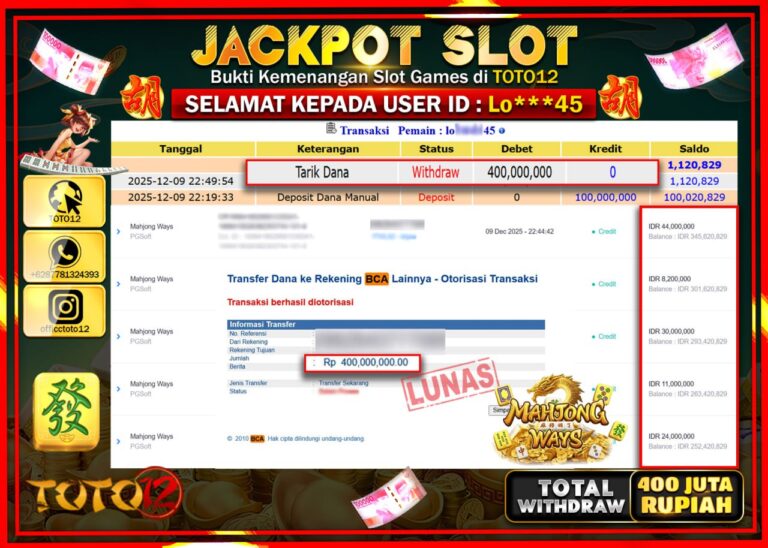 Selamat kepada Member Kami Lo****** Telah Jackpot dan berhasil mendapatkan kemenangan besar pada permainan JACKPOT SLOT GAME (MAHJONG WAYS) Dengan Kemenangan Sebesar Rp.400.000.000 –. Setelah mengisi Fomulir Withdraw dengan Kurang waktu 1-2 Menit Dana sudah kami Trasnfer kepada Pemilik Userid dan dana sudah dapat di cairkan oleh pemenang. Bukti Pembayaran yang TOTO12 berikan merupakan Bukti Pembayaran…