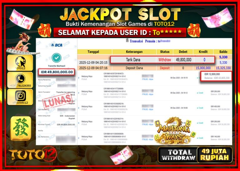 Selamat kepada Member Kami To****** Telah Jackpot dan berhasil mendapatkan kemenangan besar pada permainan JACKPOT SLOT GAME (MAHJONG WAYS) Dengan Kemenangan Sebesar Rp.49.800.000 –. Setelah mengisi Fomulir Withdraw dengan Kurang waktu 1-2 Menit Dana sudah kami Trasnfer kepada Pemilik Userid dan dana sudah dapat di cairkan oleh pemenang. Bukti Pembayaran yang TOTO12 berikan merupakan Bukti Pembayaran…