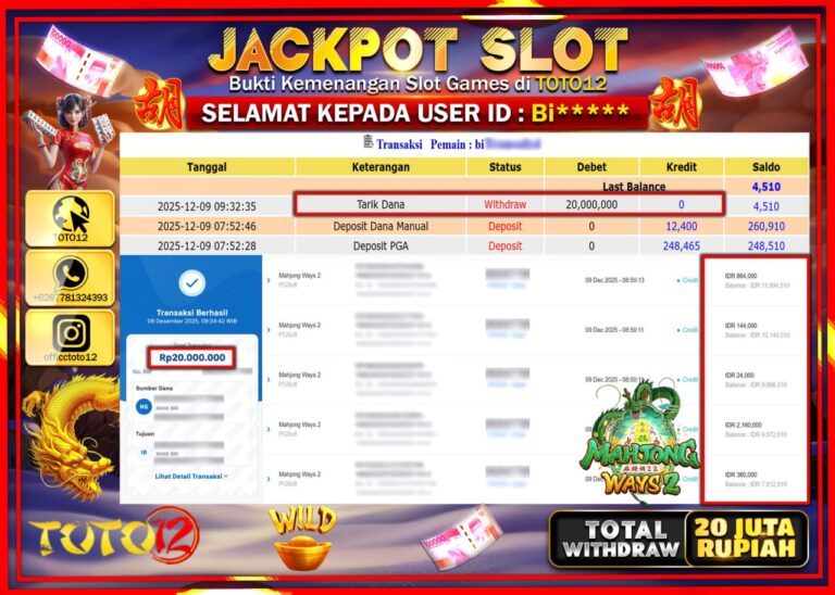 Selamat kepada Member Kami Bi****** Telah Jackpot dan berhasil mendapatkan kemenangan besar pada permainan JACKPOT SLOT GAME (MAHJONG WAYS 2) Dengan Kemenangan Sebesar Rp.20.000.000 –. Setelah mengisi Fomulir Withdraw dengan Kurang waktu 1-2 Menit Dana sudah kami Trasnfer kepada Pemilik Userid dan dana sudah dapat di cairkan oleh pemenang. Bukti Pembayaran yang TOTO12 berikan merupakan Bukti…
