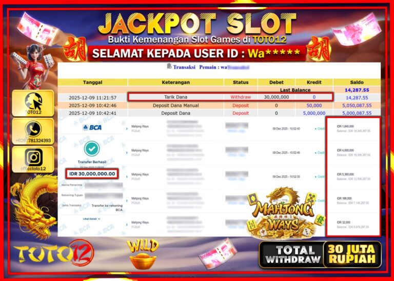 Selamat kepada Member Kami Wa****** Telah Jackpot dan berhasil mendapatkan kemenangan besar pada permainan JACKPOT SLOT GAME (MAHJONG WAYS) Dengan Kemenangan Sebesar Rp.30.000.000 –. Setelah mengisi Fomulir Withdraw dengan Kurang waktu 1-2 Menit Dana sudah kami Trasnfer kepada Pemilik Userid dan dana sudah dapat di cairkan oleh pemenang. Bukti Pembayaran yang TOTO12 berikan merupakan Bukti Pembayaran…